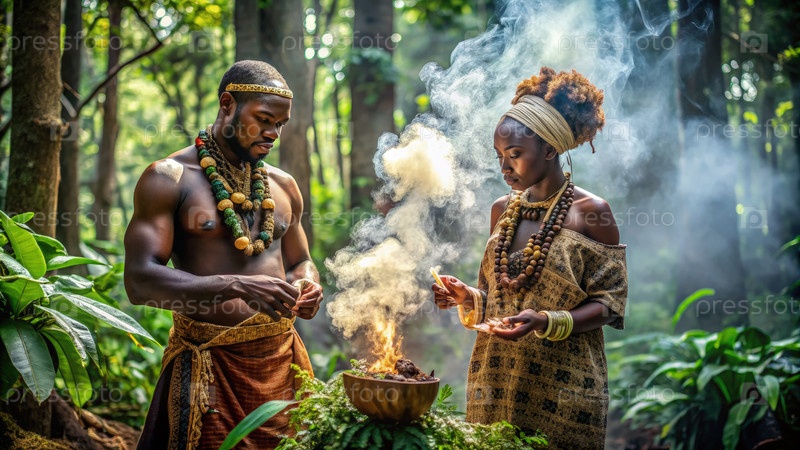 Традиционная африканская сказка с двумя фигурами, выполняющими ритуалы в пышном лесу