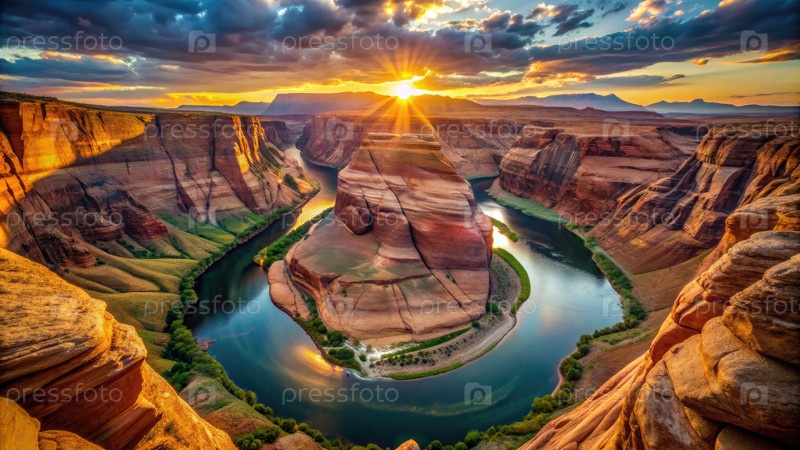Великолепный восход солнца над прочным каньоном с светящейся рекой на горизонте