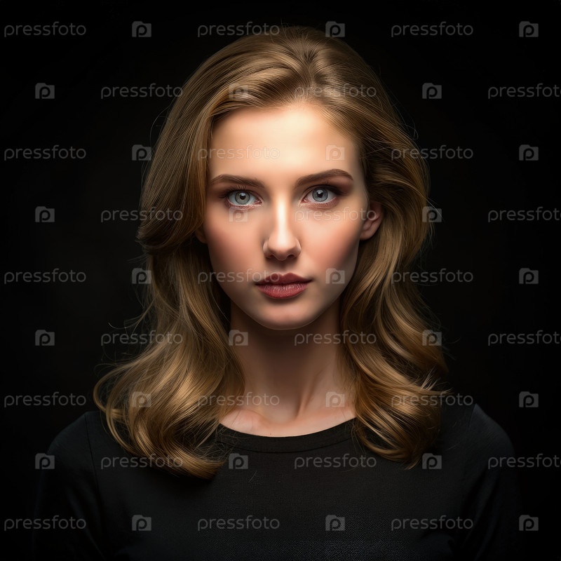 Портрет женщины с подсветками в волосах на черном фоне, захватывающий момент спокойной уверенности и грации в обстановке студии