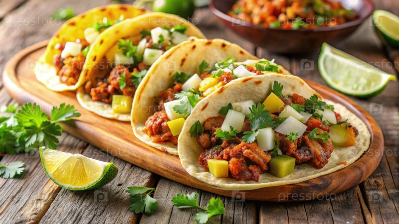 Тако аль пастор подают на деревянной тарелке с лаймом и кориандром