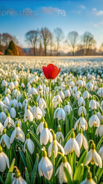 Потрясающий ранний утренний вид на обширное поле, заполненное нежными снежинками с одним ярко-красным тюльпаном, выделяющимся среди белых цветов
