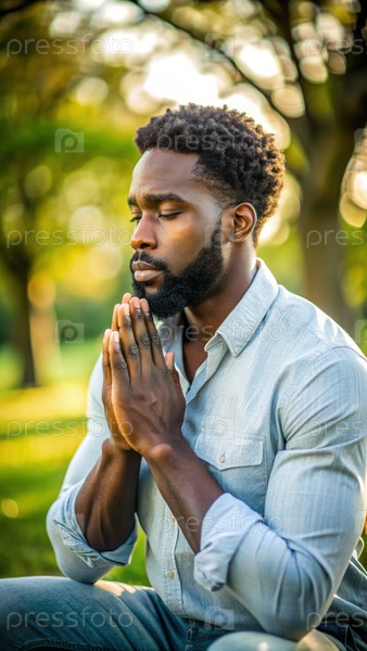 Африканский американец медитирует на открытом воздухе в парке во время Золотого часа