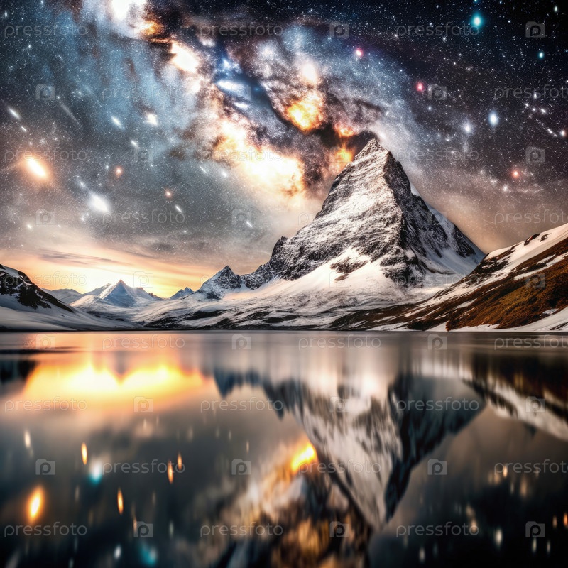 Снежная горная вершина отражается на воде под звездной галактикой в сумерках