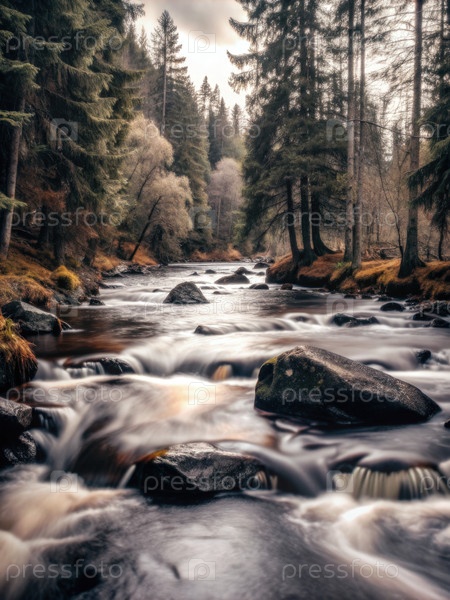 Спокойная лесная река, протекающая сквозь скалы и деревья в пасмурный день