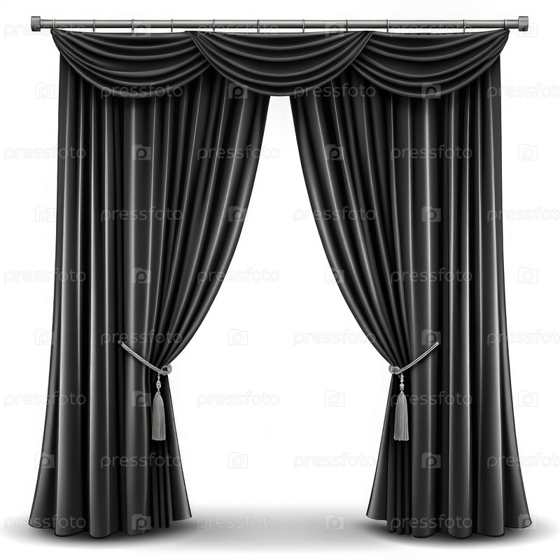Элегантные чернобархатные шторы изящно драпируются от стержня на чистом белом фоне, создавая поразительный визуальный контраст в этом классическом дизайне