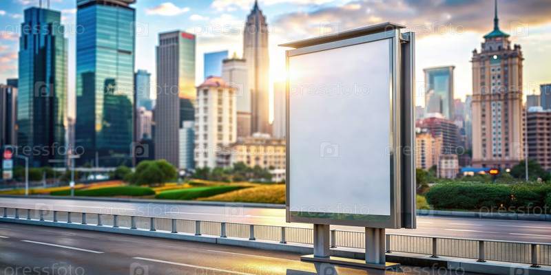 Пустой белый рекламный щит на улице города во время заката с размытым городским пейзажем в фоне