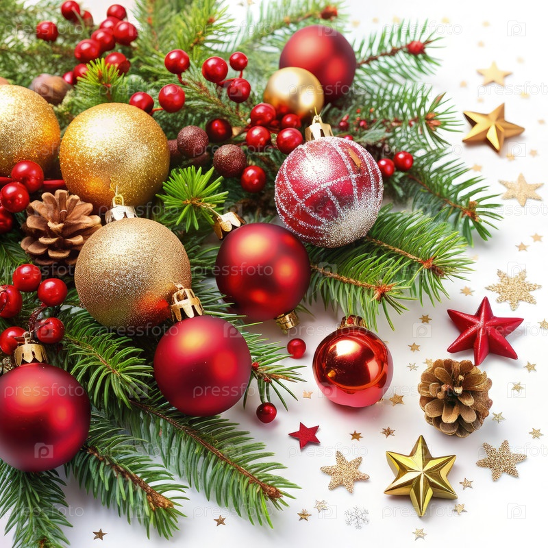 Праздничные рождественские украшения с разноцветными орнаментами, сосновыми ветвями и яркими акцентами на ярком веселом фоне в праздничный сезон