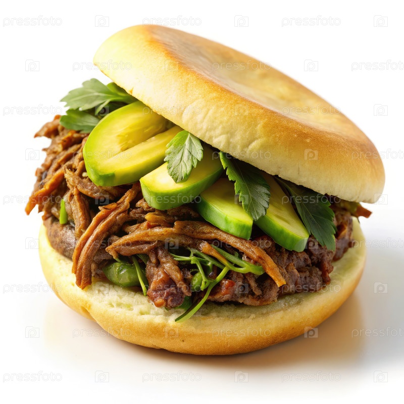 Удовлетворяющая арепа, набитая измельченной говядиной и свежим авокадо на стандартной тарелке
