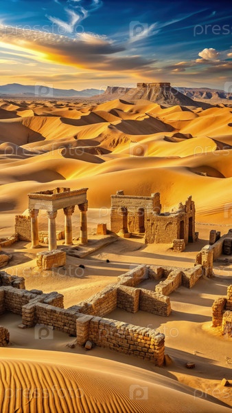 Древние руины, окруженные золотыми пустынными дюнами под ярким небом