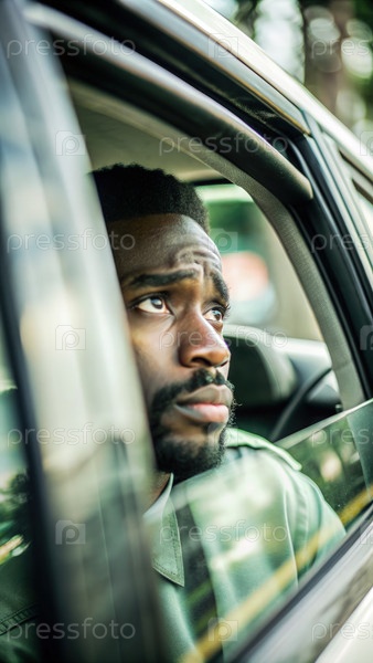 Цветный мужчина задумчиво смотрит из окна полицейской машины днем в городской обстановке