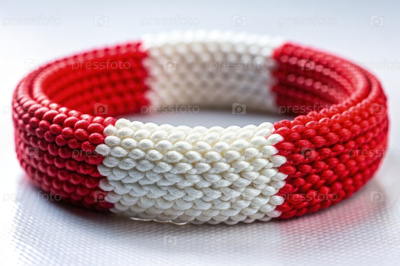 Браслет с изображением цветов польского флага, выполненный из тканих материалов и опирающийся на плоскую поверхность