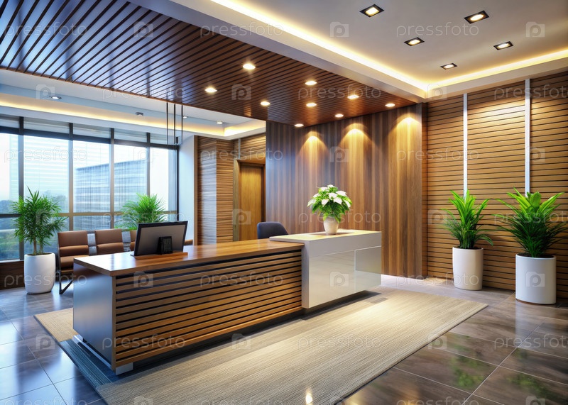 Современная офисная зона приема с стильным дизайном, естественным светом и зелеными растениями в корпоративной среде