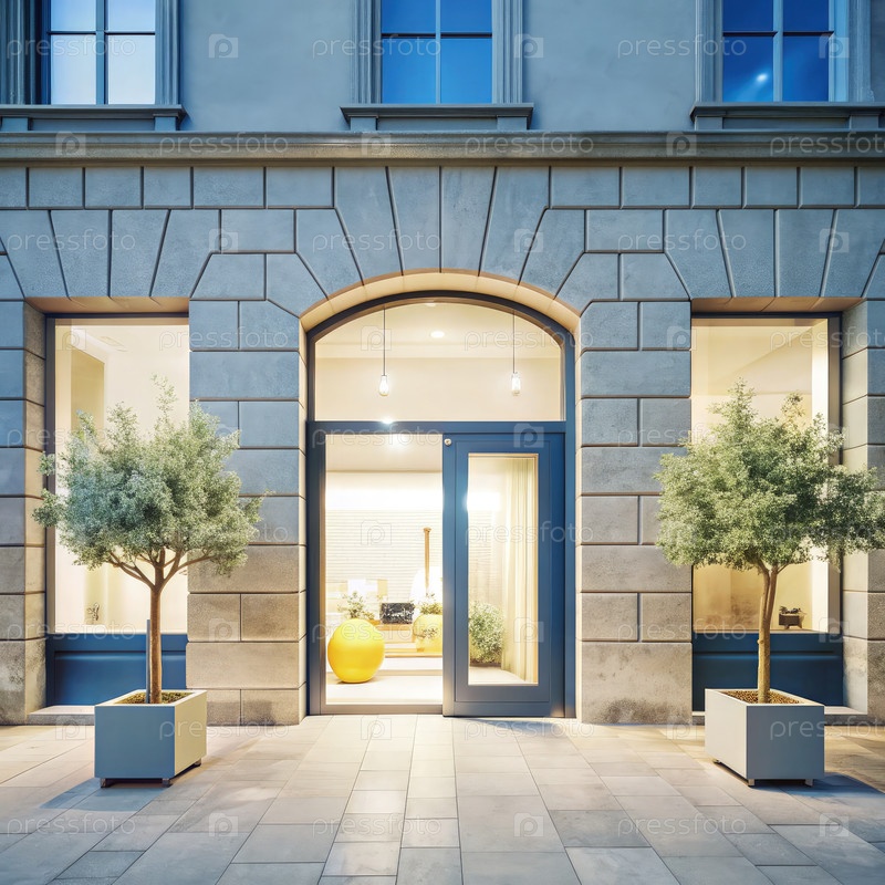 Вход в современный салон красоты с зеленью в городской обстановке