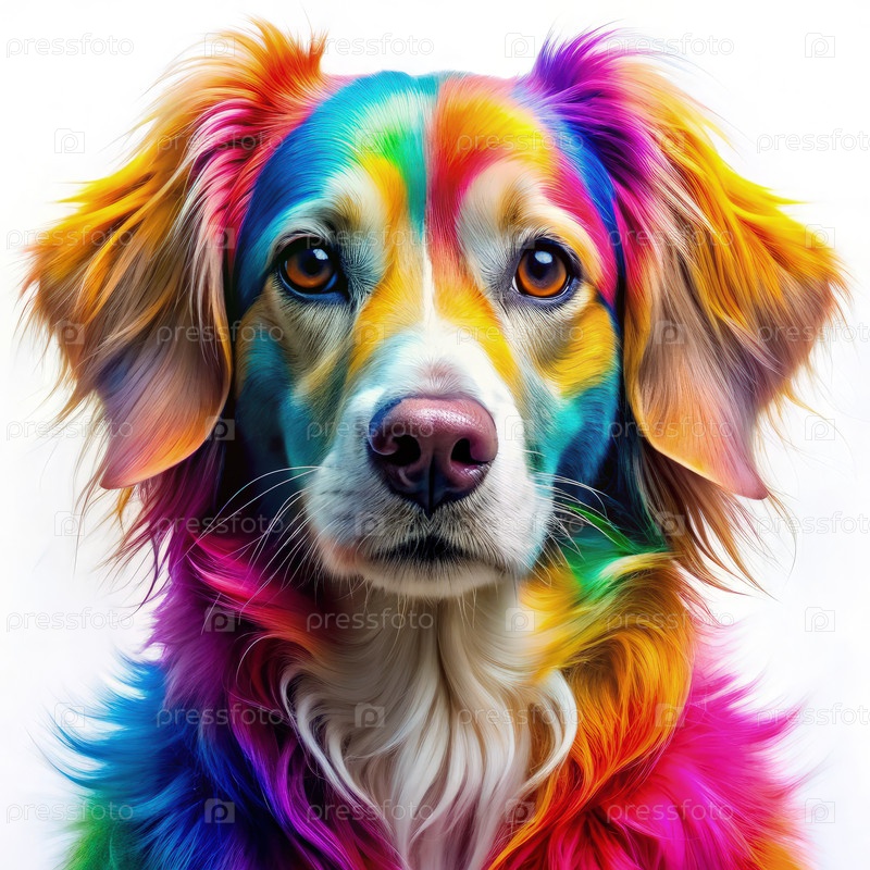 Яркая, красочная собака с яркой шерстью позирует на белом фоне, демонстрируя свою уникальную красоту и игривую личность в светлой дневной обстановке