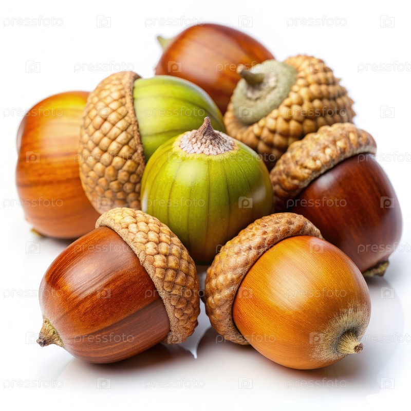 Разнообразные желуди различных цветов и размеров, изолированные на белом фоне для изучения природы или декорации