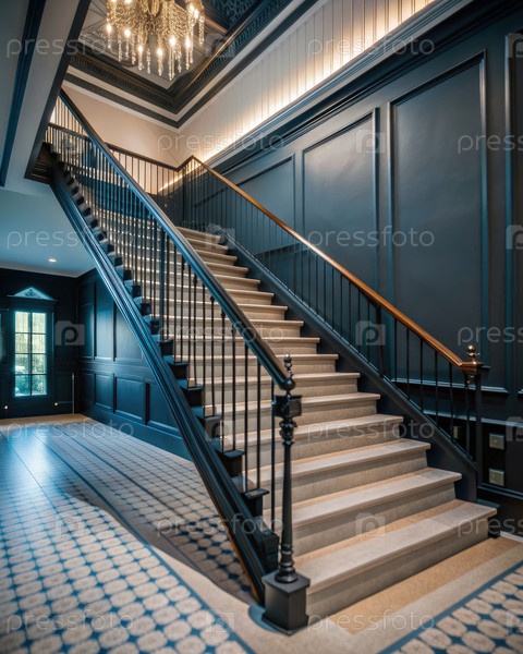 Красиво спроектированная лестница с элегантной люстрацией и сложным напольным покрытием из плитки в классической интерьерной обстановке в дневное время