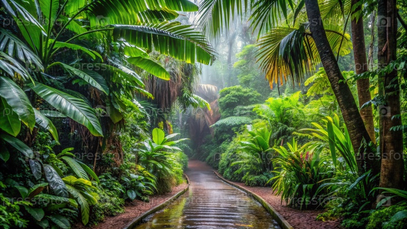 Дождь каскадирует через пышный джунгли путь, окруженный яркой зелени