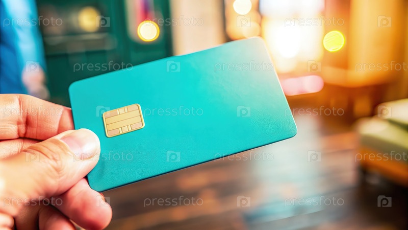 Рука, держащая тонкую банковскую карту в современном хорошо освещенном помещении