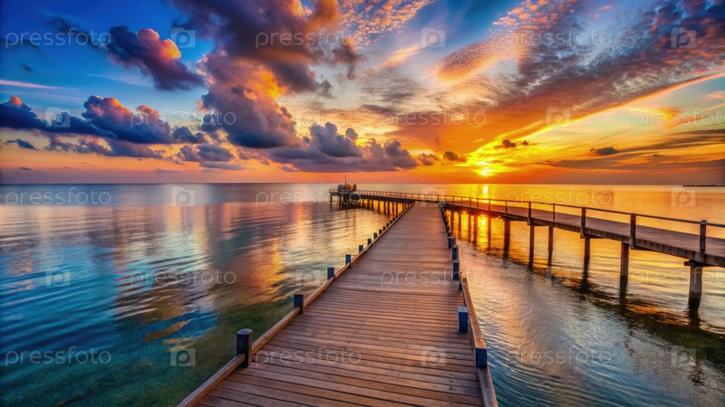 Спокойный деревянный пирс, простирающийся над спокойным морем на ярком горизонте захода солнца