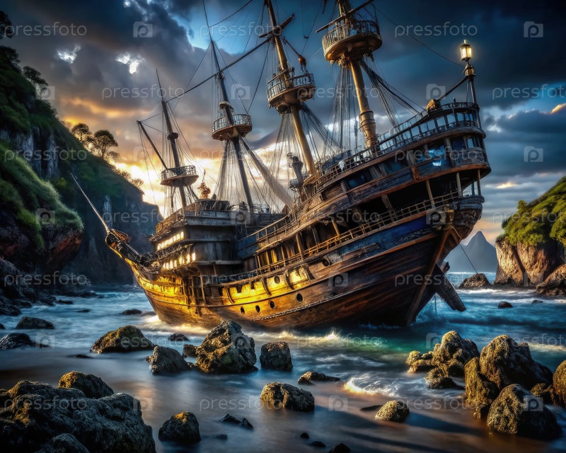 Обломки дислоцированного пиратского корабля на скалистом берегу при закате солнца с драматическим небом