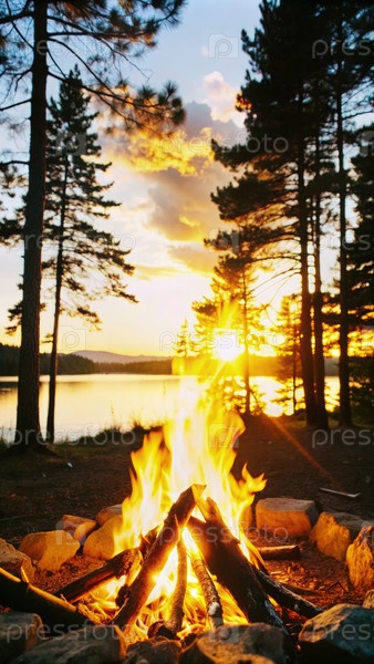 Уютный костер у озера на закате, в окружении высоких деревьев в лесу