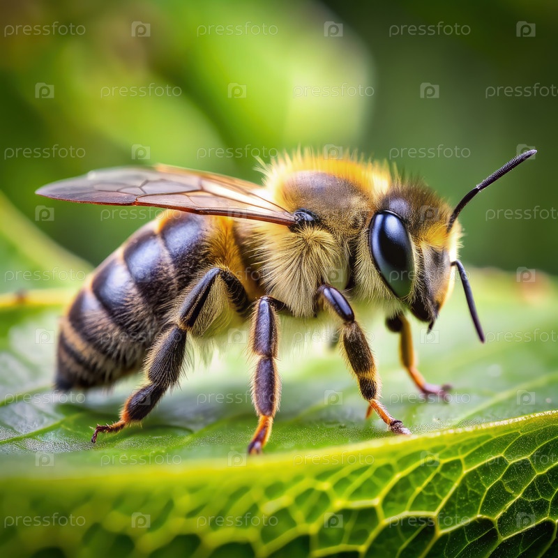 Близкий снимок пчелы, отдыхающей на ярком зеленом листе во время солнечного дня в пышном саду, демонстрирующем красоту природы и биоразнообразие