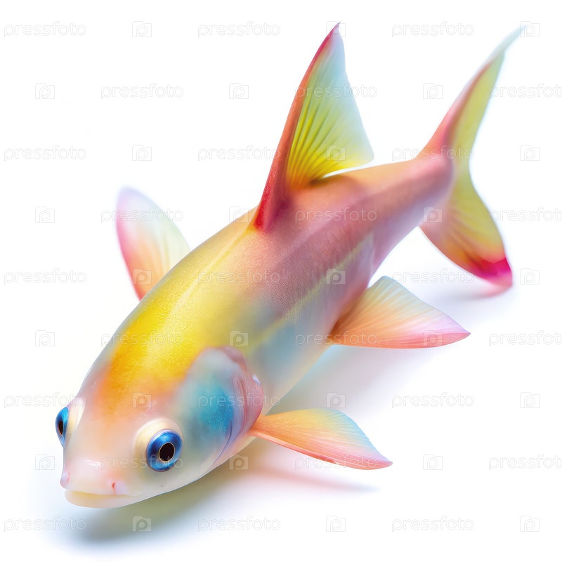 Альбиносная радужная акула плавает на белом фоне с яркими цветами и отчетливыми крыльями, видимыми при ярком освещении