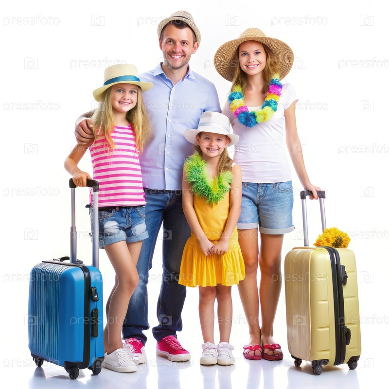 Молодая семейная пара готовится к захватывающим летним каникулам с детьми в ярких нарядах