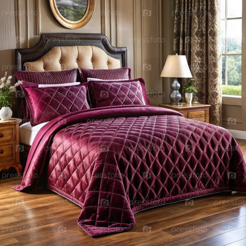 Роскошное бархатное одеяло на стильной деревянной кровати в уютной спальне