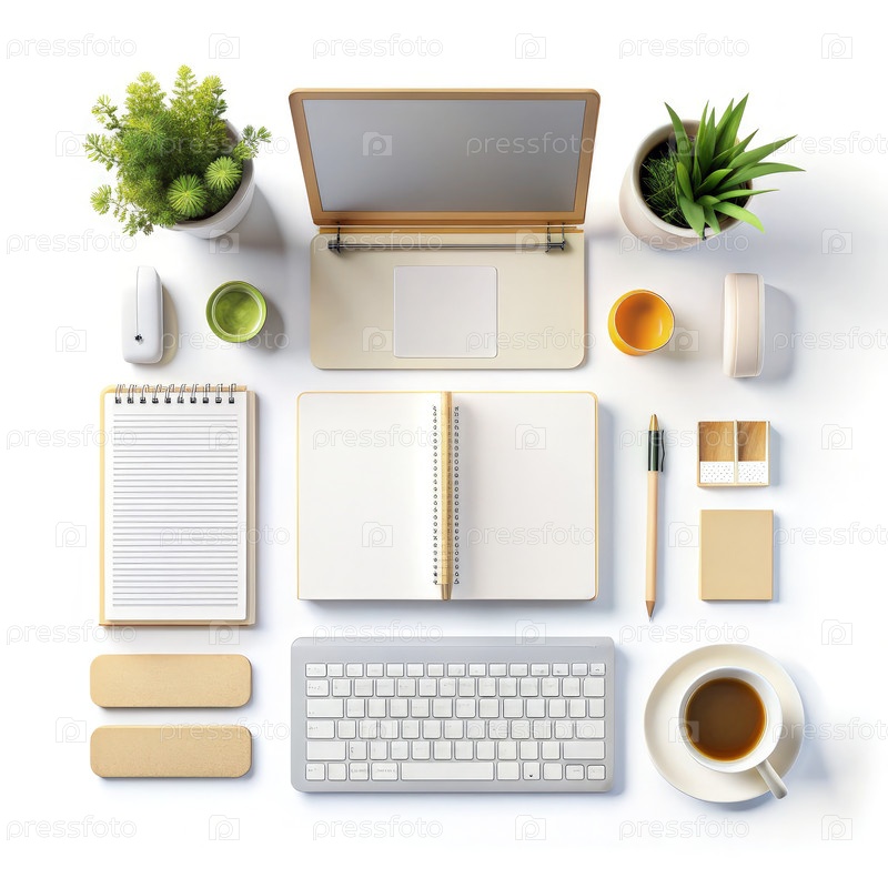 Сборник канцелярских принадлежностей из дома с ноутбуком, растениями и кофе на столе