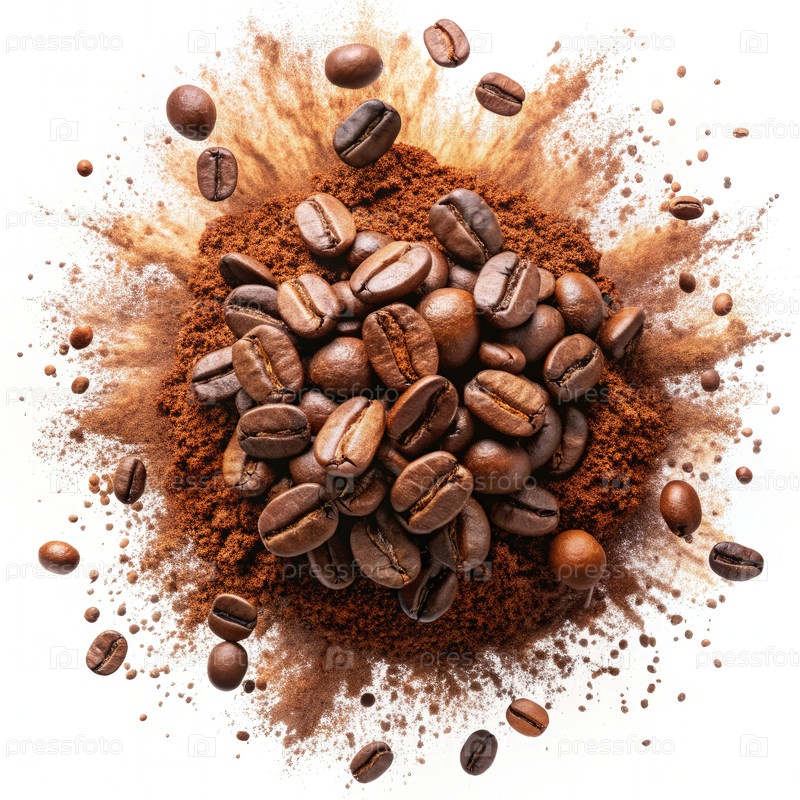 Взрыв измельченного кофе с целыми зернами, изолированными на белом фоне