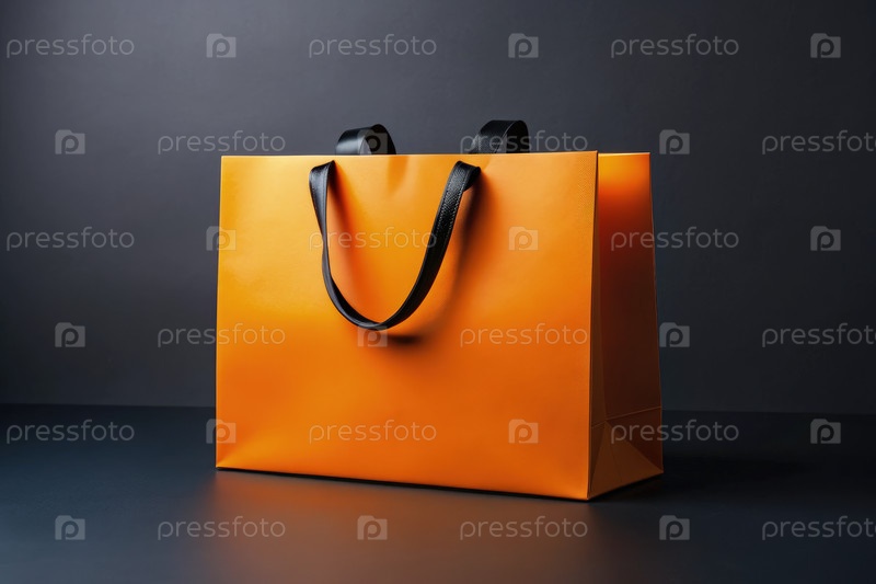 Роскошный оранжевый бумажный пакет с черными ручками на темном фоне