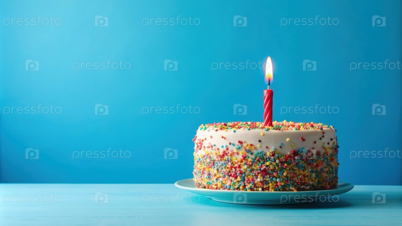 Красочный торт на день рождения с рассыпаниями и одной свечкой на простом синем фоне, идеально подходит для праздничных моментов