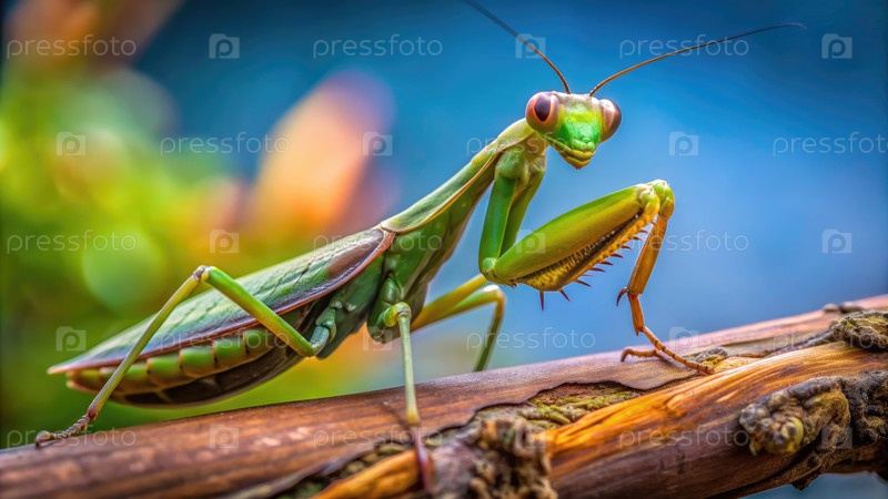 Ближайшее изображение зеленой молитвенной манты на ветке в естественной среде обитания днем