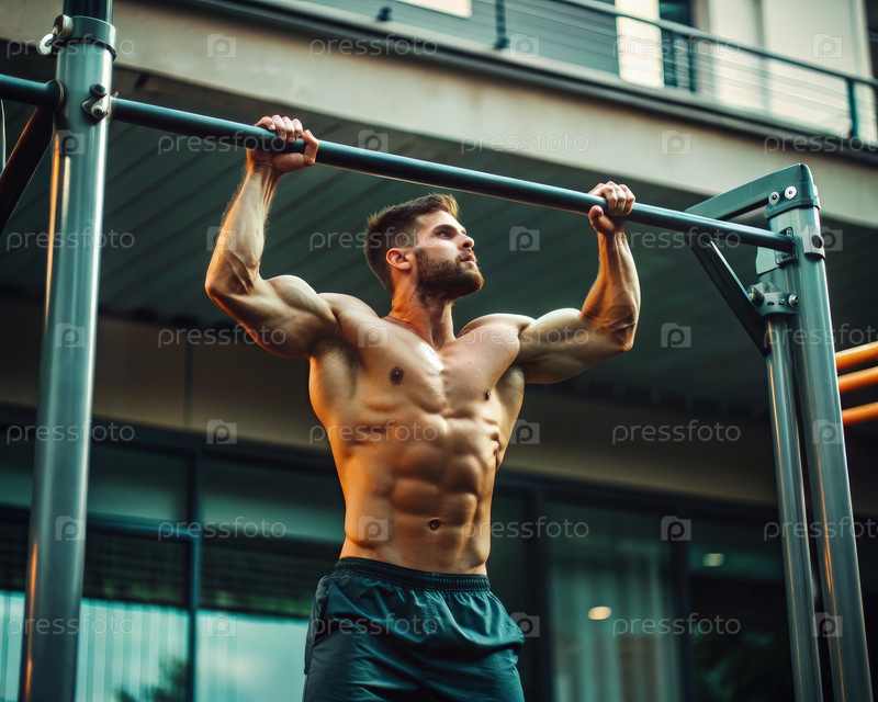 Мужчина выполняет силовые упражнения в современном тренажерном зале на открытом воздухе поздним днем