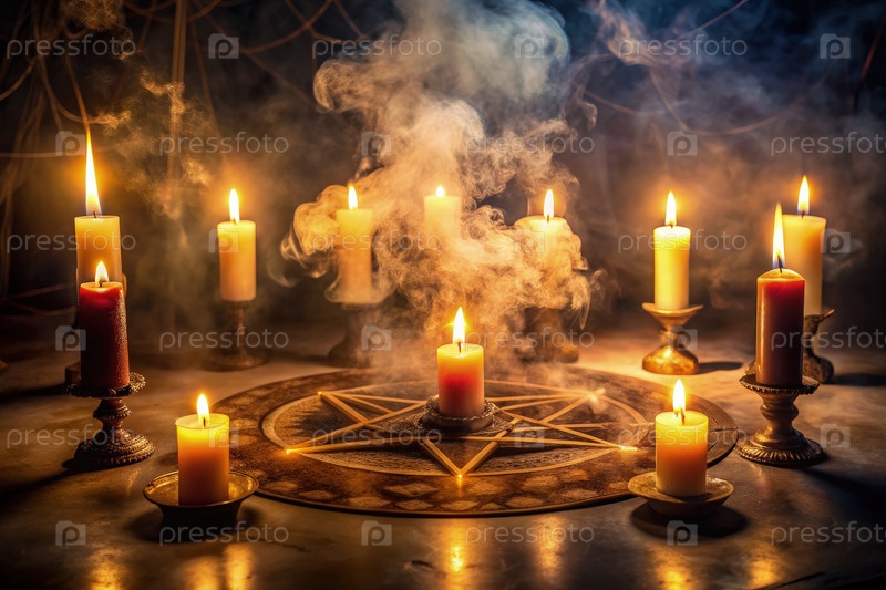 Магический символ, окруженный свечами и дымом в темную мистическую ночь