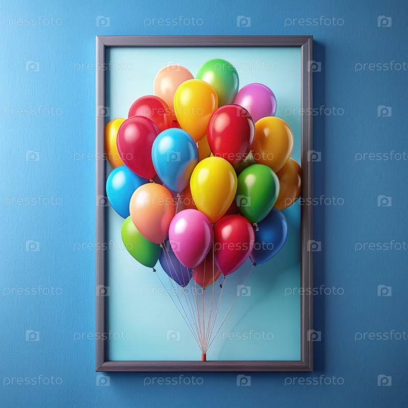 Красочные воздушные шары в рамочном дисплее на синей стене, демонстрирующие яркие оттенки и праздничный внешний вид