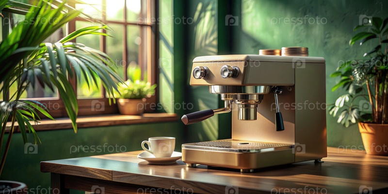 Бежевый кофемашин изящно сидит на деревянном столе в ярко-зеленой кофейне, купающейся утром в естественном солнечном свете