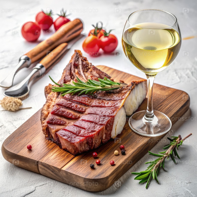 Жареное нарезанное стейк-томагавк с свежими травами и бокалом белого вина