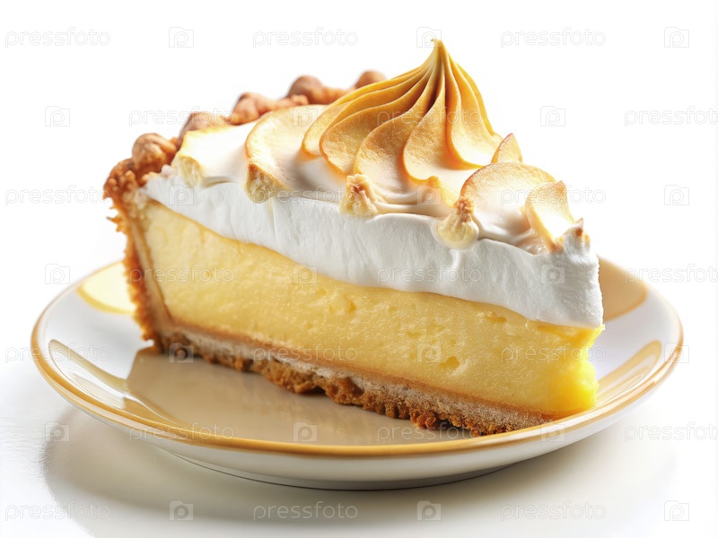 Кусок пирога из лимонного меренге на маленькой тарелке с золотой корой