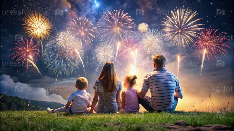 Семья наслаждается фейерверком, сидя ночью на травяном холме