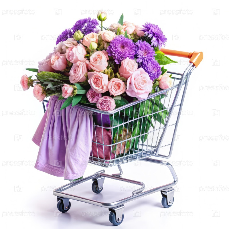 Красочная корзина супермаркета переполнена свежими цветами в солнечный день