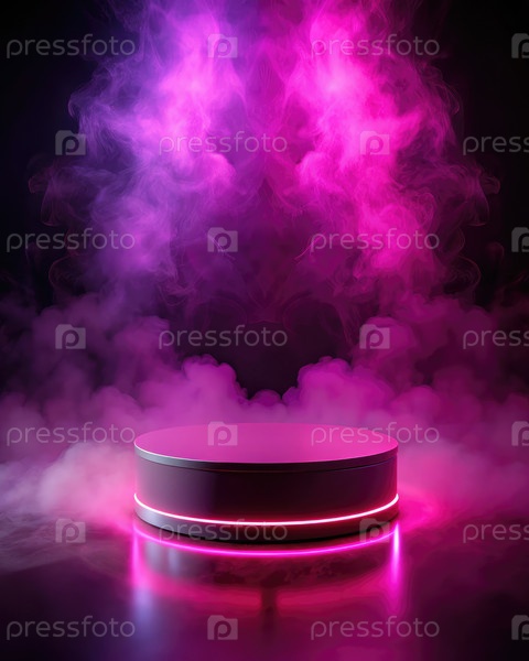 Неоновый розовый пустой подиум, окруженный ярким дымом в минималистической обстановке