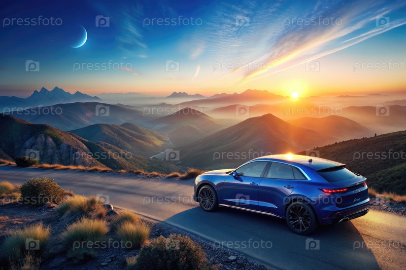Задний вид гладкого современного автомобиля с видом на горы при закате солнца