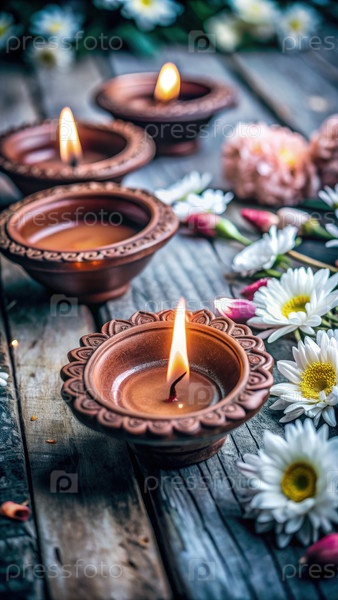Традиционные масляные лампы с цветами на деревянном столе во время праздничного торжества