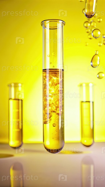 Подвешенная пробирка с золотой жидкостью на ярко-желтом фоне