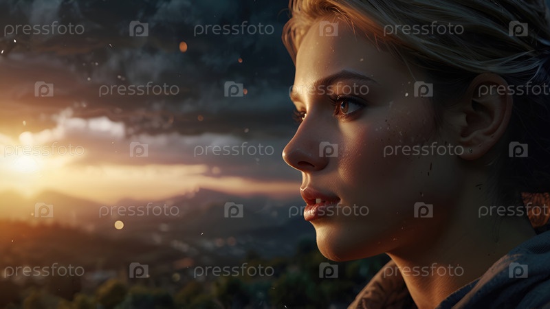 Женщина, вдумчиво смотрящая на закат солнца над живописным пейзажем