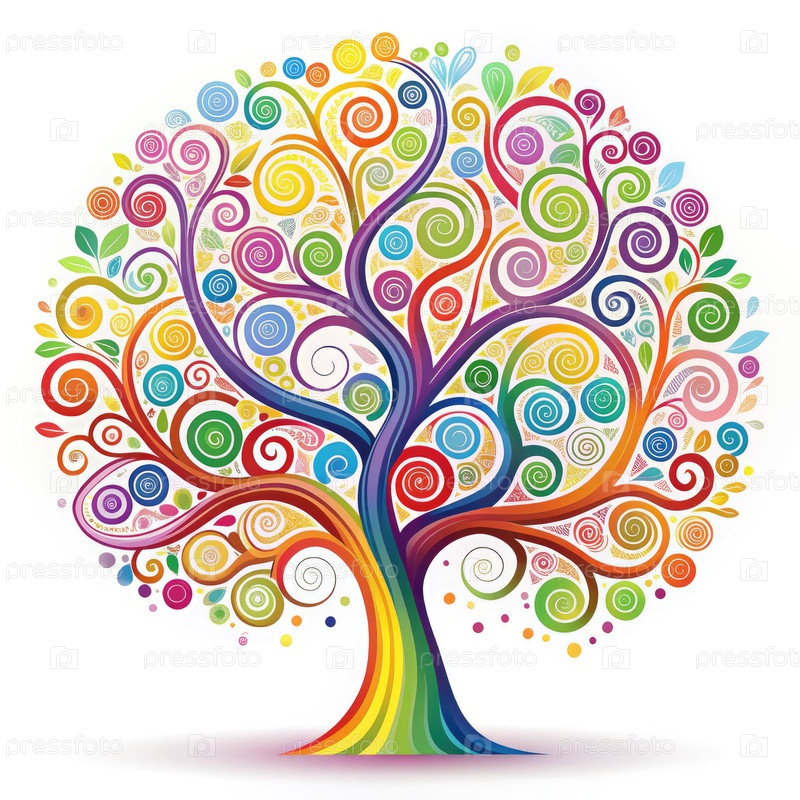 Живое дерево с вращающимися узорами и красочными ветвями в причудливой обстановке