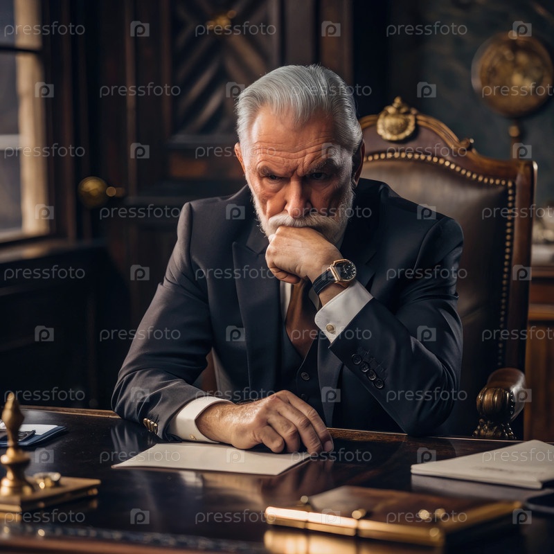 Пожилой мужчина в костюме размышляет за дорогим столом в роскошном офисе
