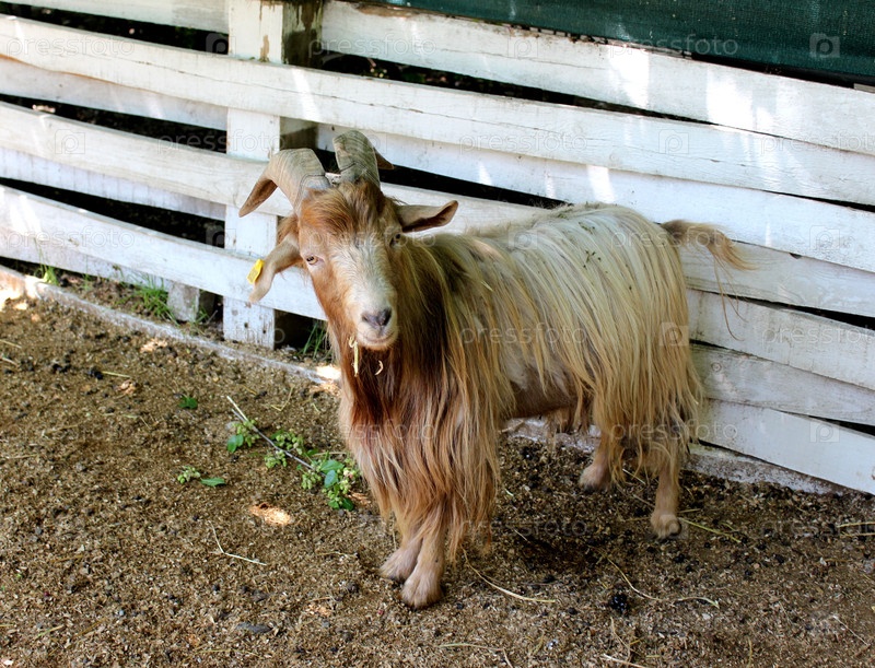 Портрет козла бурой масти во весь рост в загоне зоопарка
